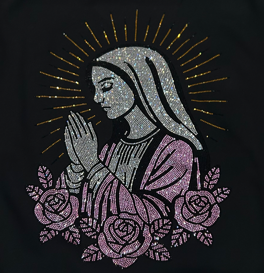 ALWAYS BLESSED - RED VIRGIN RHINESTONES - BLACK CREWNECK